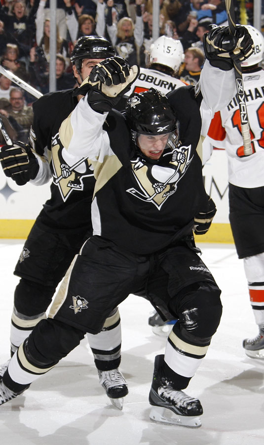 The Penguins took on the Flyers last night at Mellon arena, and I'm not going to lie I was thinking shutout early in the second period. If you didn't get to see the game you probably would have been in the same boat after seeing the Pens dominate the Flyers offensively and defensively. But after the Penguins jumped out to a commanding 3-0 lead in a period and a half there was a little what I like to call "Madden Magic" you know the shit that happens in video games that should never happen, well the Flyers scored a couple fluke goals and it gave them the 4-3 lead at the end of the second. This pretty much ended the night for MAF, which played stellar until the Pens seemingly lost the momentum after they gained the three goal lead. On came Sabu in the third where he shut down the Flyers and allowed the Pens to tie the game 4-4 late in the period on another Crosby goal, sending the game into a shootout. There were a couple close ones on Sabu but he shut down all six shooters while Alex Goligoski put one by Martin Biron as the sixth shooter for his first shootout goal. Crosby(2), Malkin, and Cooke all tickled the twine in this one. Time for the highlights.