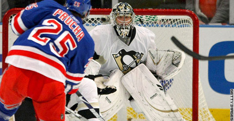 For the second time this season the Penguins gave up a multiple goal lead in the third period to lose game. This time the Rangers tied the game with 8.1 seconds remaining in regualtion after Crosby missed an empty netter from the neutral zone. Pens goals were scored by Sydor in the 1st period and the second goal by Crosby in the 2nd period. The Rangers got on the board with a powerplay goal from Naslund.