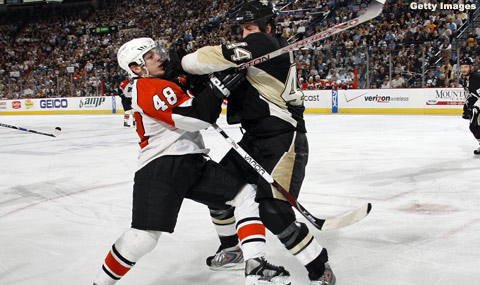 This year's first edition of Pens vs. Flyers was a fight to the finish it even required almost an entire overtime period to be decided by a Pascal Dupuis score making the final score 3-2 in favor of the Mighty Penguins. Goals were scored in the game Orpik, Zigomanis, and the overtime goal by Dupuis.